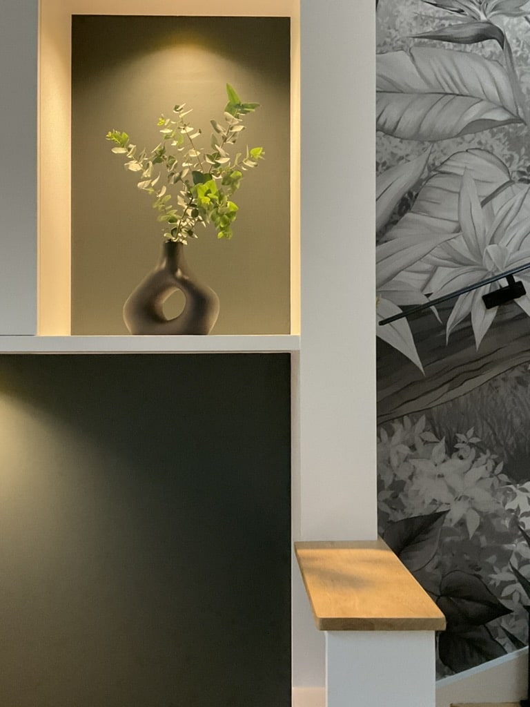 L’ajout stratégique d’un papier peint permet à l’entrée d’être à la fois conviviale et originale accentuant la hauteur sous plafond, réel atout de cette pièce.