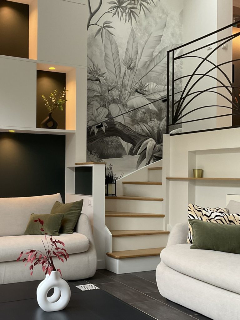 Habillé d’un revêtement de sol souple, l’escalier de ce grand duplex s’harmonise avec un papier peint beige aux nuances délicates.